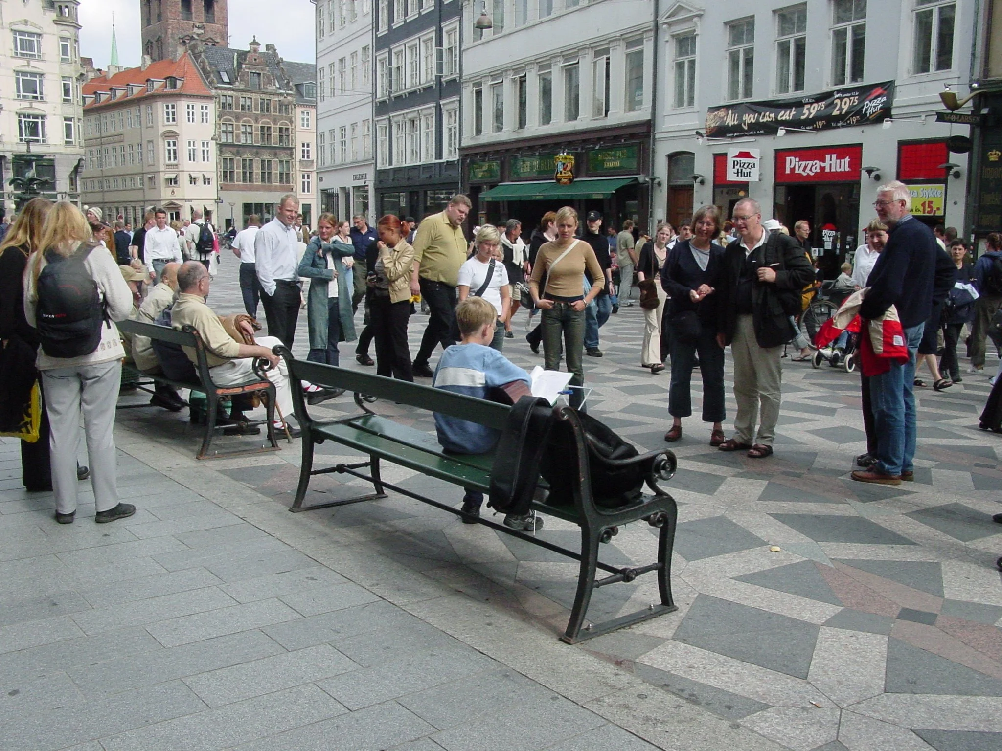 The “Stroget”(in 2002) in Copenhagen , like many examples of highly walkable streets derives its activity not from the provision of pavement upon which pedestrians can move, but from the provision of activities along the entire street and the density/intensity of uses in the surrounding buildings. Conventional planning measures “walkability” using technical specification for pavement and circulation. Walkability should be measured with non-technical attributes providing high intensity social and economic activities. (See below for other key attributes of an effective pedestrian street)