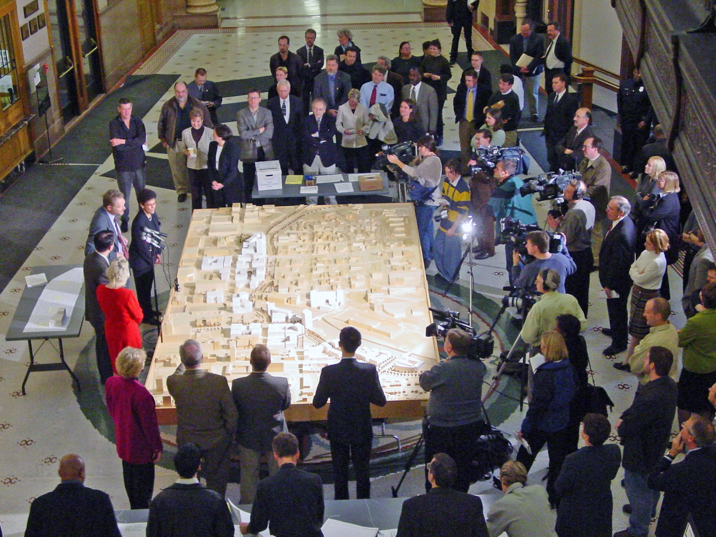 This large scale model of Milwaukee’s Park East Redevelopment Plan incorporated movable “white pieces” for new buildings on each lot to make the concepts easy for public discussion and revision.
