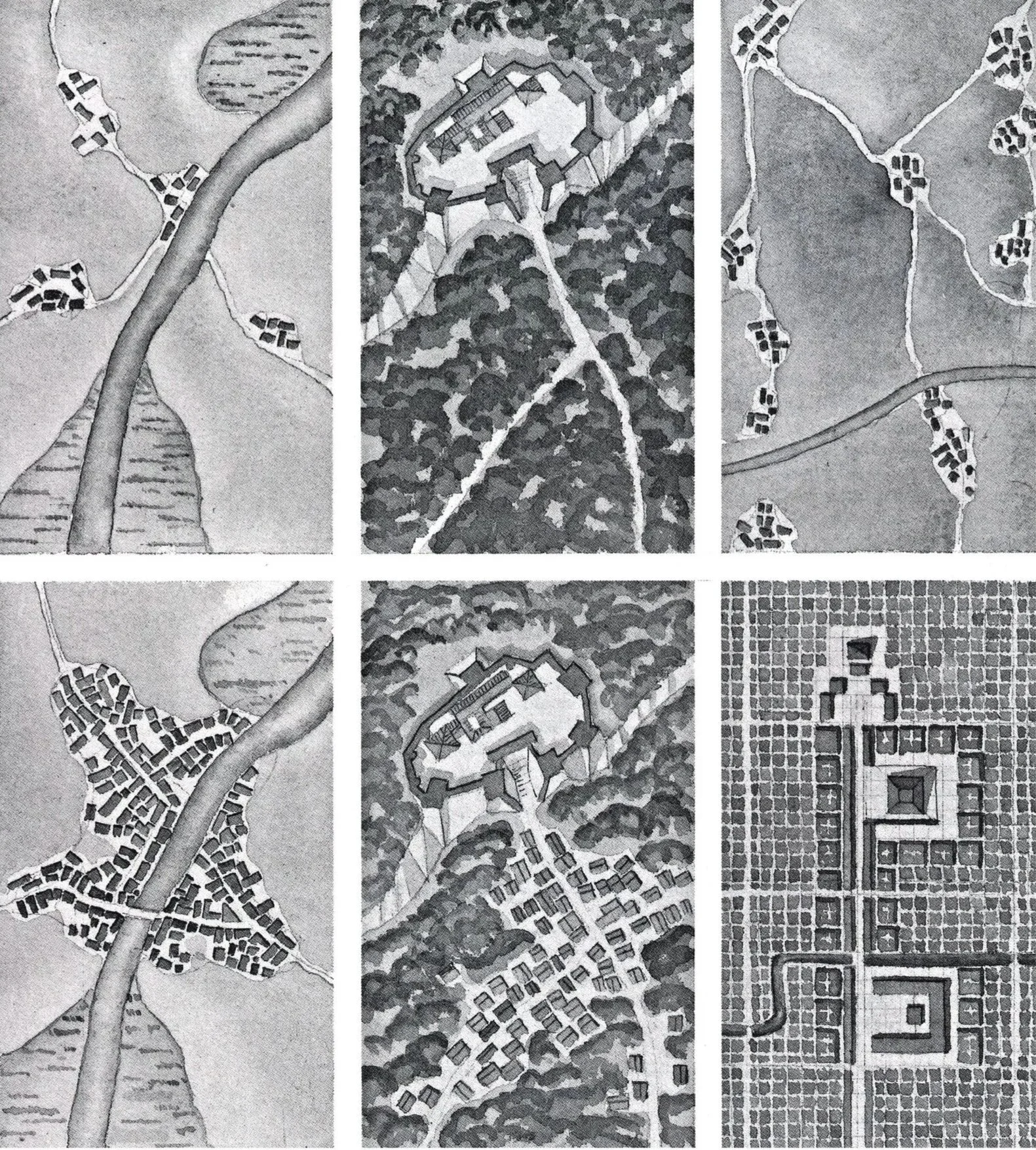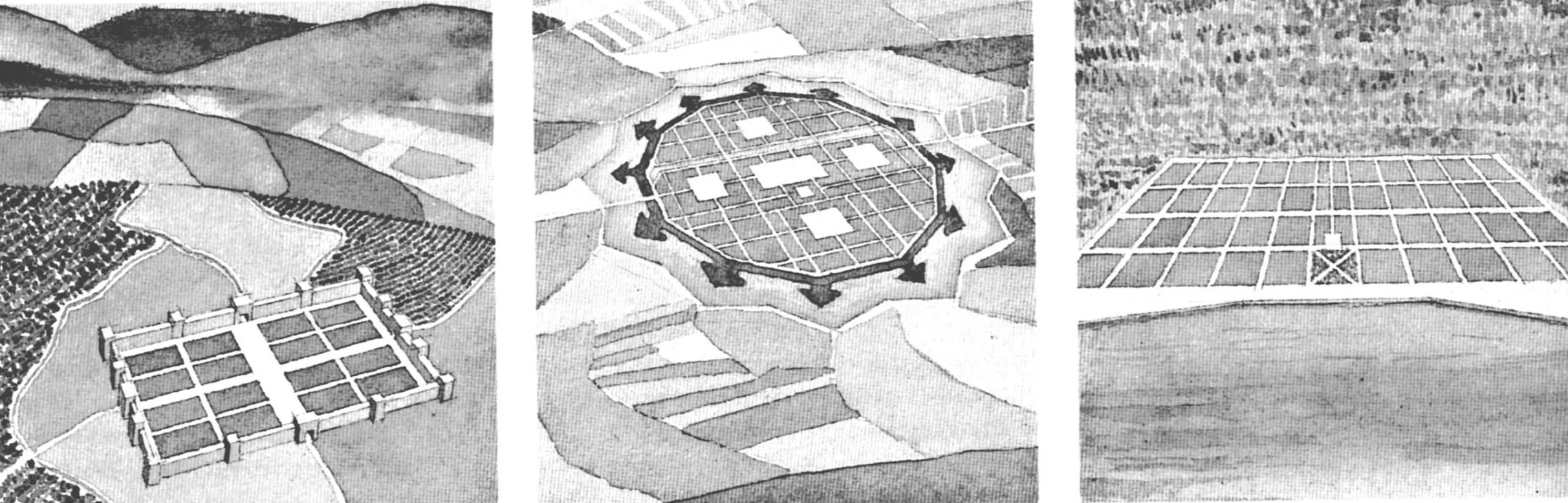 Kostof (above) offers three examples of the formation and evolution of urban patterns from left to right: four small clusters into a single community abutting a river; a single object-like fort into a central form with an emerging external grid; a series of separated enclaves into a large scale replacement with a new grid. Kostof (below) shows different variations in grid patterns: a Florentine new town from the 14th century; an ideal city plan fro 1615; and a plan for New Orleans from 1760.