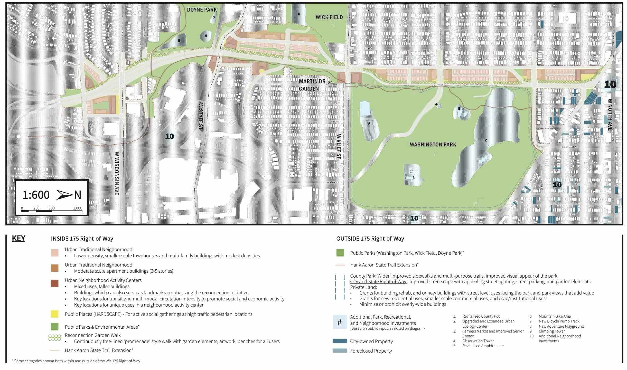 The plan above, was prepared for the Wisconsin Department of Transportation as one alternative for replacing Highway 175 in Milwaukee. The urban design embodies many of the recommendations from the books noted above including enclosure of public places, extension of major parks, object-like builds at critical neighborhood centers, building textures that fit the neighborhood and many related features. From the standpoint of city planning, this plan also includes highly detailed recommendations for new transportation facilities as well as public policies and opportunities both inside and outside of the right-of-way. This is one of numerous alternatives developed during the planning process and presented to the public.