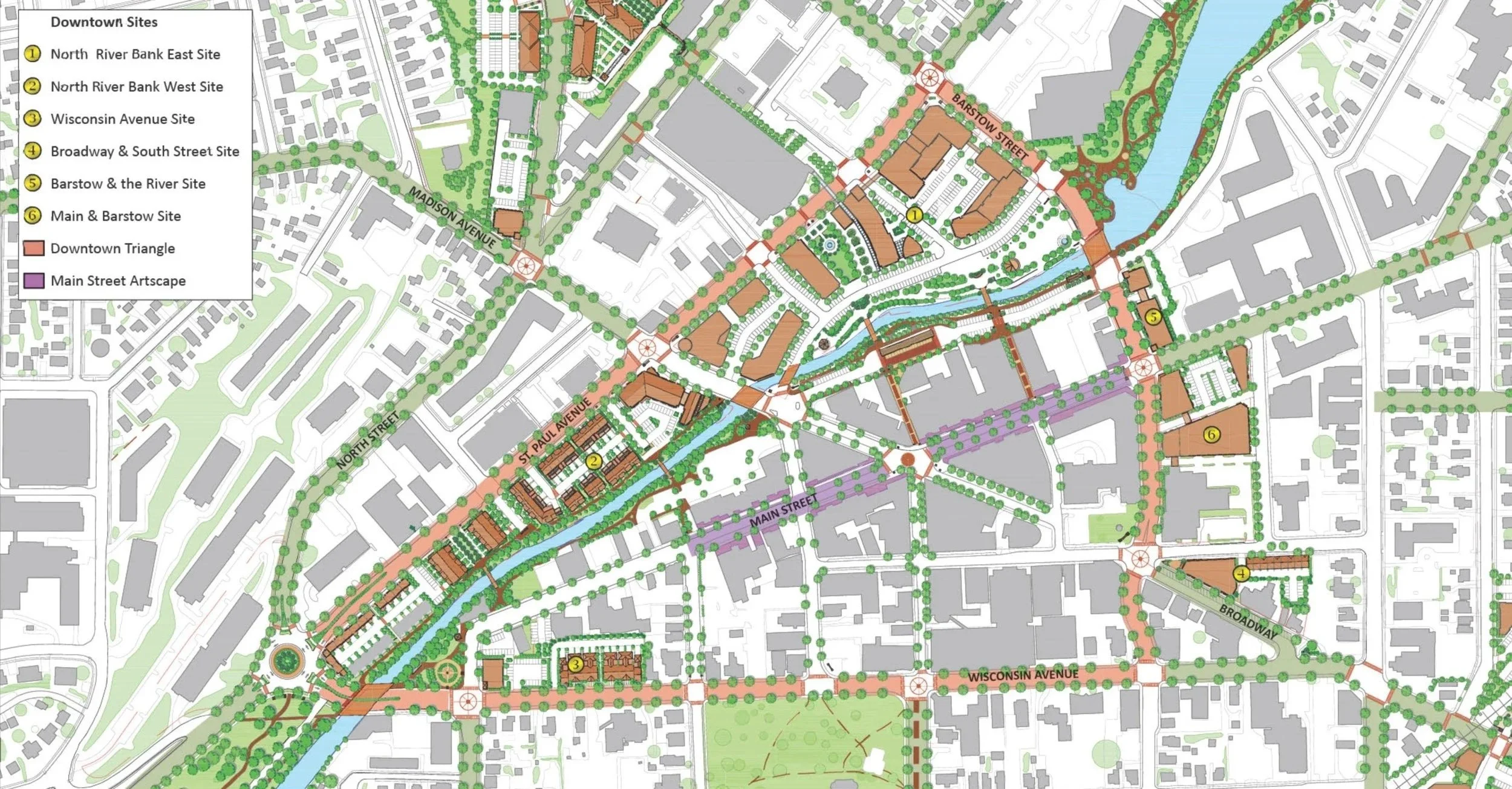 These plans were prepared for Waukesha, Wisconsin’s downtown and surrounding neighborhoods. They were customized over many months in discussions with land owners and the public with the intent of creating higher value public places. The design concepts followed many of the principles described in this essay.