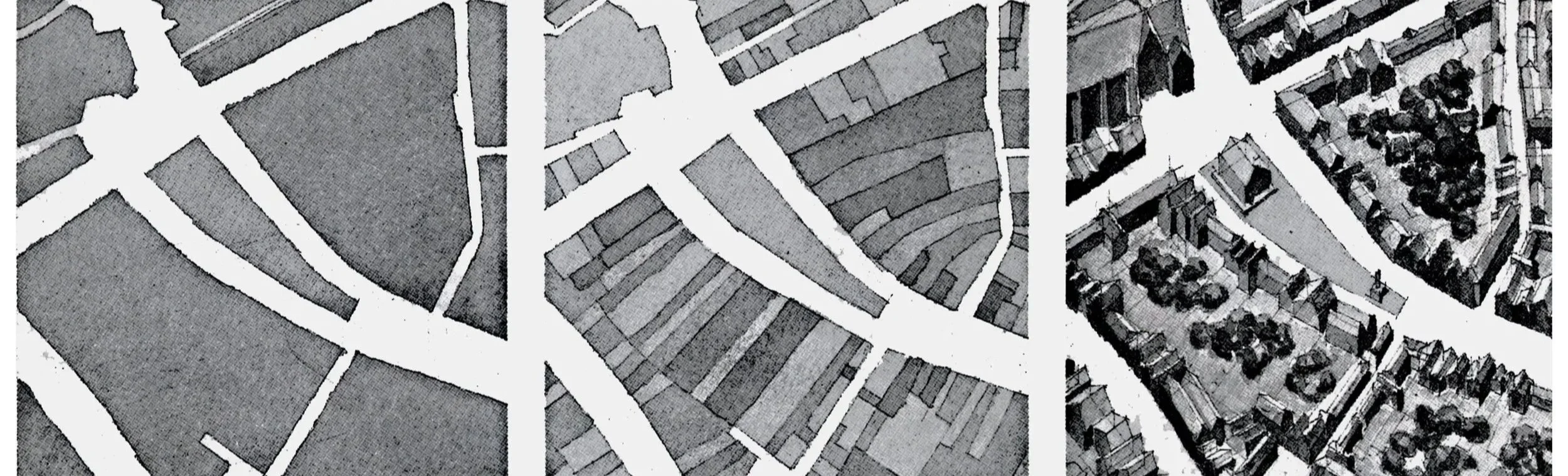 This illustration (below) of Conzen’s concepts comes from Spiro Kostof’s book, The City Shaped. The left image shows full city blocks (buildings and parcels combine leaving all streets and significant circulation elements white). The middle image, called land use, shows the property lines that differentiate ownership, where each shape can take on a different use as defined by the owner (this does not follow American land use conventions). The image on right adds building forms which, using the figure-ground concepts would simply be two-dimensional black shapes. All three modes of representation should be used by city planners — there is no “best” map.