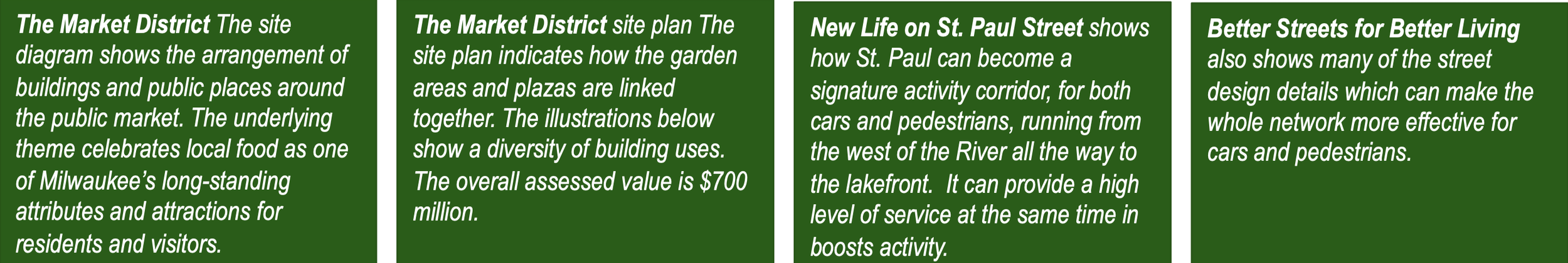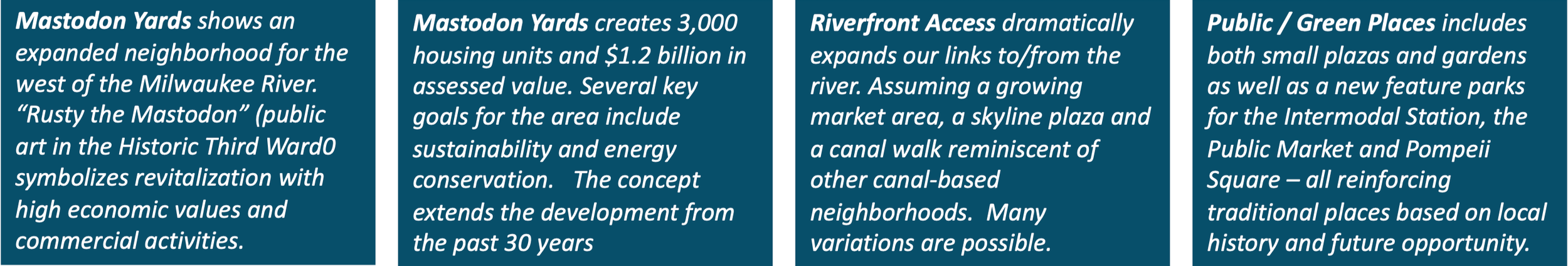 New places and neighborhoods, like the ones portrayed by the students, will grow incrementally over 30 years. Growth on new land begins in small projects at the onset of post-freeway investment. Over time, projects ramp up rapidly (like the Park East announcement followed by Riverfront housing, Moderne, Fiserv, the Public Museum, MSOE expansion, and multiple developments). The 794 corridor offers a much larger transformational opportunity that goes beyond current models. Each of the student projects foresees new development will that add a completely new dimension to Milwaukee. Thirty years ago, we did not have a Brewery District, Deer District, Northwestern Mutual Campus, or even the Harley Davidson Museum. When plans for these districts began people were doubtful, they would succeed. No one reports that the pessimists were wrong, but all the planners remember the skeptics “Who will want to live there? Where will so many people come from? It just can’/t work?” And then it happens.