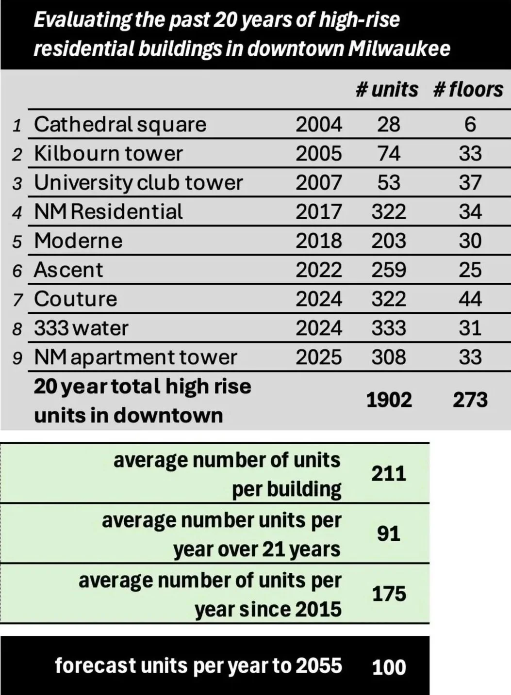 High-rise buildings have been added to downtown Milwaukee (and most cities world-wide) since the 1960s and follow a traditional pattern found along waterfronts and downtown centers. The increase in high-rise buildings in downtown Milwaukee seems to have entered is transformational shift in the early 2010s, right after the Great Recession. If this shift continues this study’s estimate of 3,000 units over 30 years is quite low. Some of the student scenarios discussed later project 6,000 or more units. Overall, a modest mid-range estimate with 3,000 units (100 per year for 30 years) seems to be a useful, and a conservative starting point.