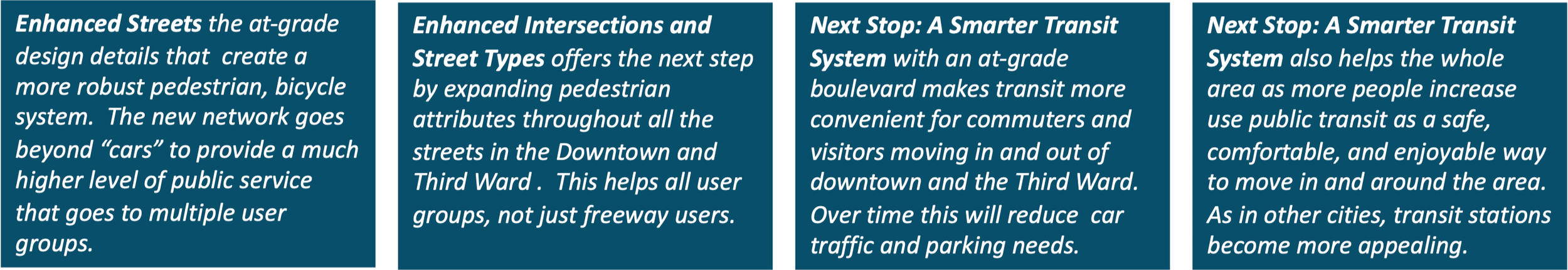 District Circulation. When freeways come down there is always a prediction of massive traffic tie-ups. It is usually the opposite case with improved grids that relieve the congestion. Local property owners and businesses frequently see any traffic changes as a challenge — In this case the fear is congestion in the Third Ward. All plans for I-794 – whether it is at-grade or elevated – will require readjustment of existing streets and intersections. The speculation that an at-grade solution will create an imbalance and add traffic to the area, With a grid system rebalances easily. The traffic slows down comfortably, pedestrian movement increases, more people use transit, and more business opportunities arise. The history of the Third Ward from its rebirth in the 70s until today is testament to the ability to adapt and thrive.