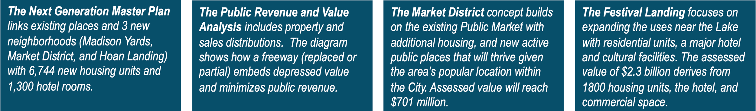 The I-794 land is at the heart, the point of highest value, the place of greatest potential attraction that will extend, expand, leverage, revive, engage, and stimulate the city that is already here. This area will not remain an example of a Jane Jacobs “border vacuum”. In fact, the student scenarios below are NOT a single plan — they are many overlapping plans which, over time, might inform and inspire different combinations or outcomes. From the perspective of urban redevelopment, there is not one “full removal” plan but hundreds of possible plans. These scenarios are the starting point, not the conclusion. Many design and development realities should be explored, especially in terms of adding net revenue for community-wide neighborhoods, region wide environmental improvements, and districts that will be impacted positively by this project.
