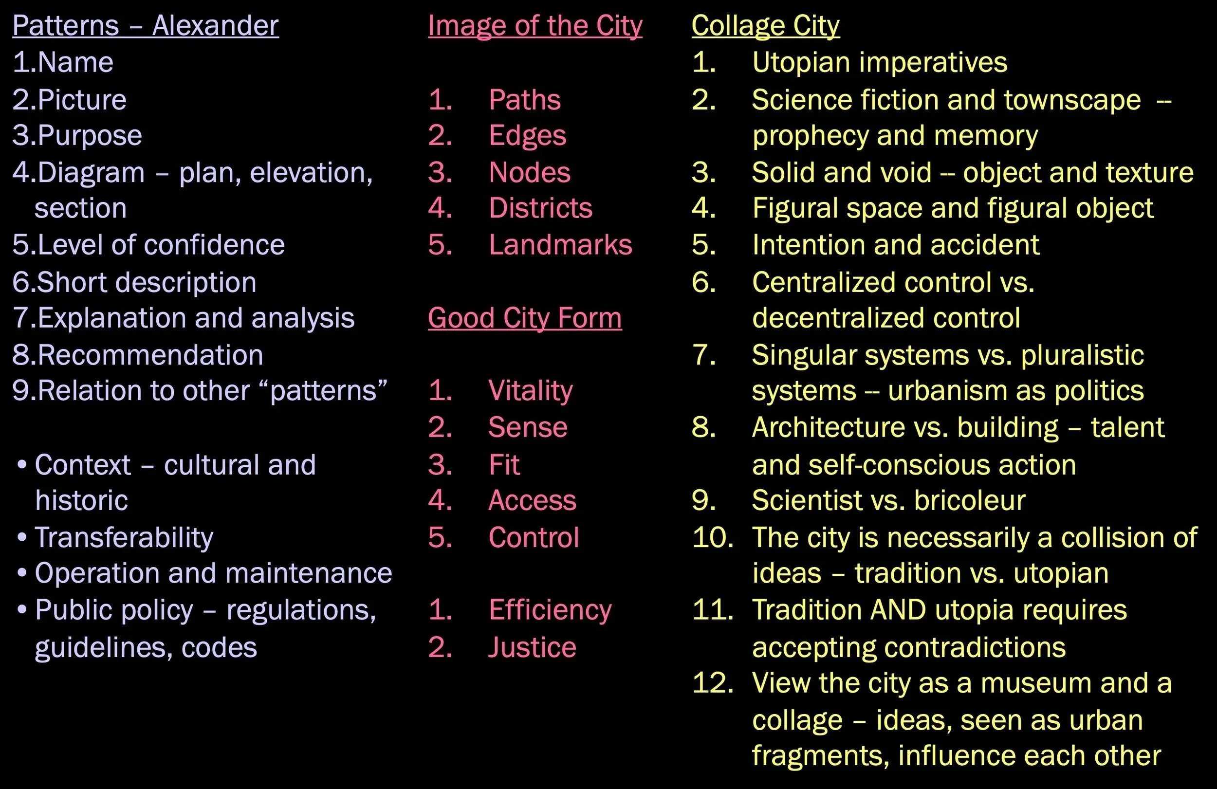 During the lecture series on urban design I discuss several theories which have pragmatic value for planning practice. The image to the left lists critical issues in the theories which I emphasize.