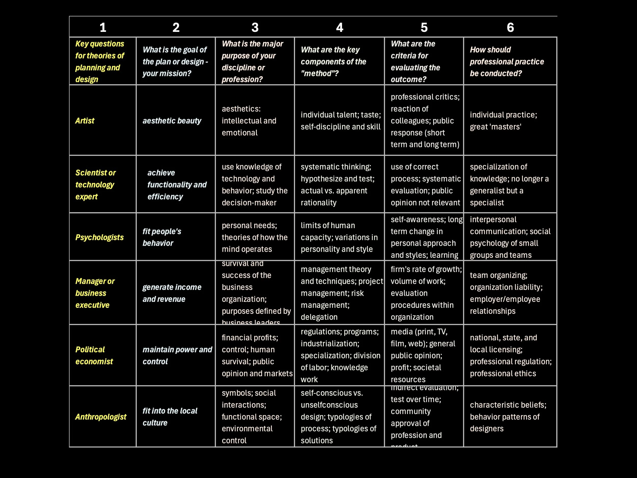 As a graduate student, learning the different models of planning practice advocated in different fields, I created this matrix with the intent of understanding that any attempt at planning and urban design practice probably needed to allow for a broad range of theories, often with inherent contradictions, to govern professional practice. The educational goal is to help students become more open-minded.